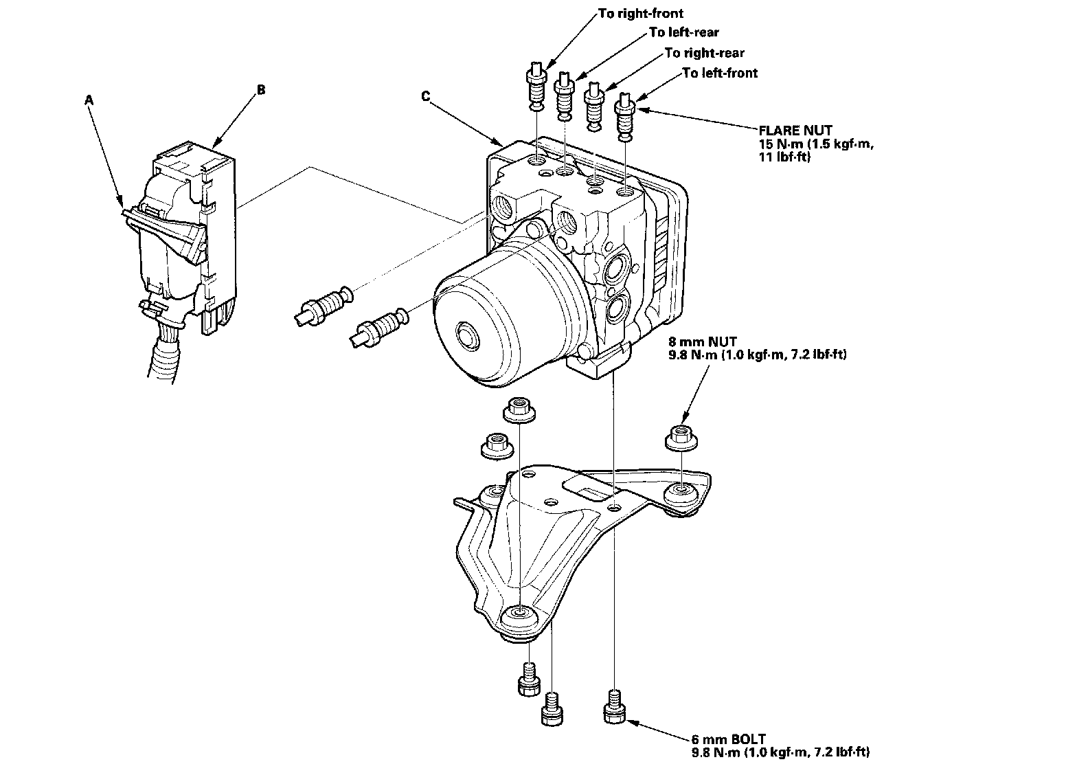 1. Install the VSA modulator-control unit, then tighten the three 6 mm nuts.