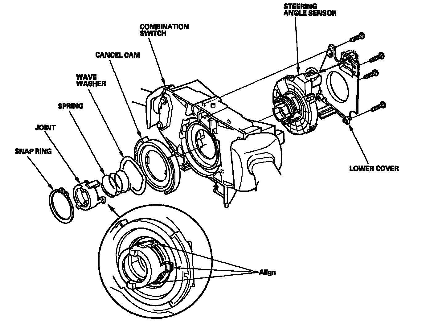 2. Remove the snap ring and screws, then remove the steering angle sensor from the combination switch.