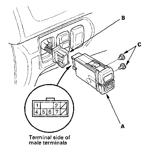 3. Check for continuity between the terminals in each switch position according to the table. If there is no continuity, replace illumination bulbs (C) or the switch.