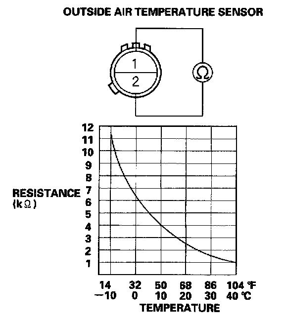 Compare the resistance reading between the No. 1 and No. 2 terminals of the outside air temperature sensor with the specifications shown in the graph; the resistance should be within the specifications.