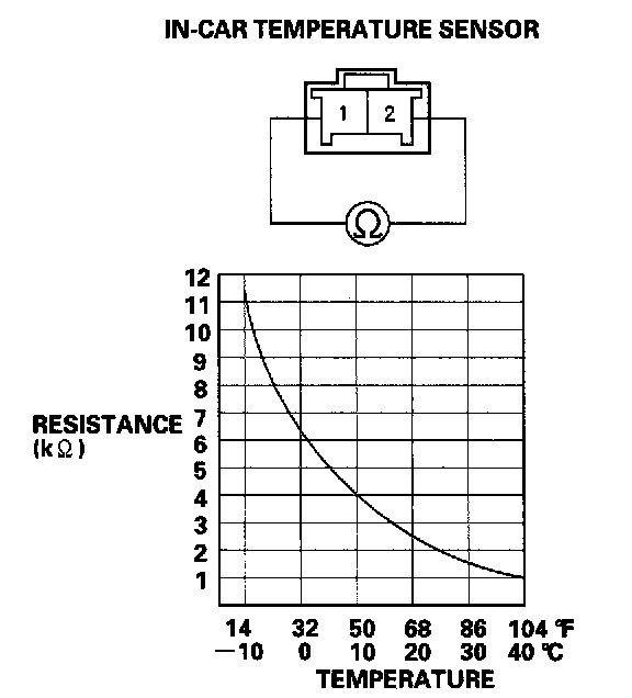 Compare the resistance reading between the No. 1 and No. 2 terminals of the in-car temperature sensor with the specifications shown in the graph; the resistance should be within the specifications.