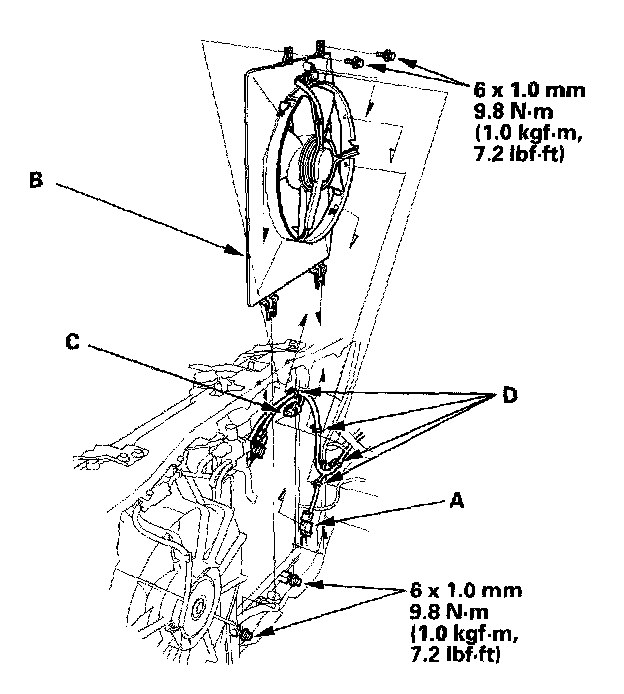6. Remove the compressor clutch connector (A) from the condenser fan shroud (B), then disconnect the connector. Disconnect the condenser fan connector (C), then remove the wire harness clips (D) from the condenser fan shroud. Loosen the lower mounting bolts, then remove the upper mounting bolts and the condenser fan shroud. Be careful not to damage the radiator fins when removing the condenser fan shroud.