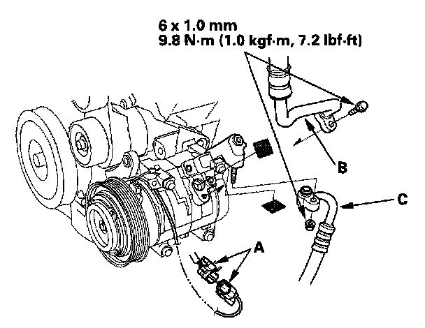 7. Disconnect the compressor clutch connector (A) remove the bolt and the nut, then disconnect the suction line (B) and discharge line (C) from the compressor. Plug or cap the lines immediately after disconnecting them to avoid moisture and dust contamination.