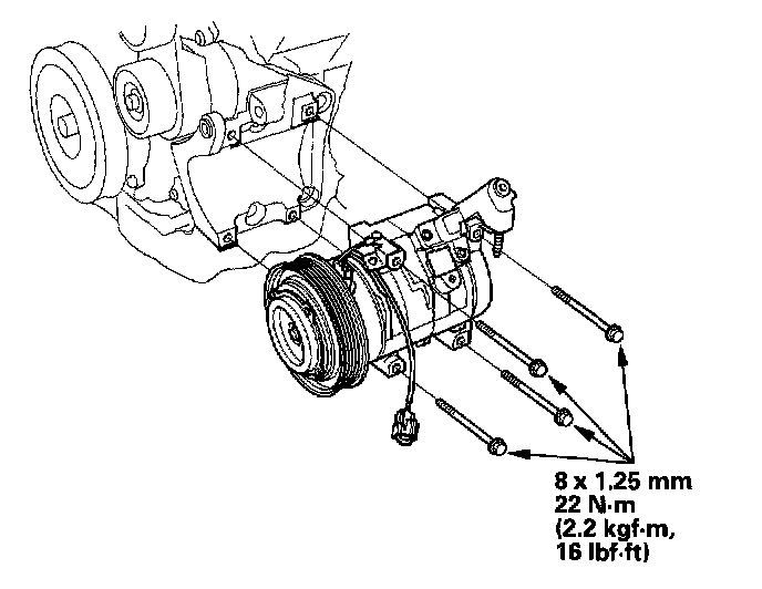 8. Remove the mounting bolts and the compressor. Be careful not to damage the radiator fins when removing the compressor.