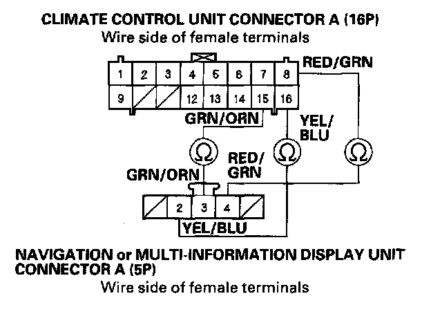 3. Check for continuity between the following terminals of climate control unit connector A(16P) and navigation or multi-information display unit connector A (5P).