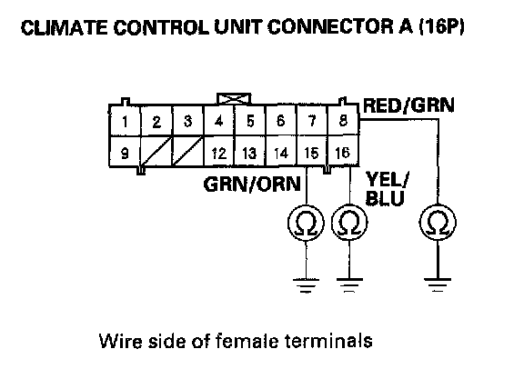 4. Check for continuity between the body ground and climate control unit connector A (16P) terminals No. 8, 15 and 16 individually.