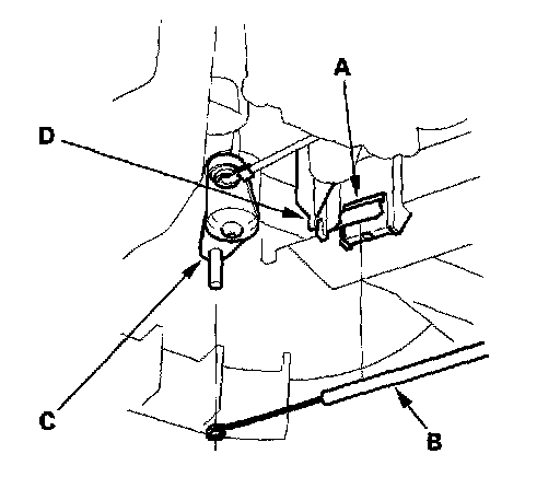 4. Attach the heater valve cable (B) to the air mix control linkage (C) as shown above. Hold the end of the heater valve cable housing against the stop (D), then snap the heater valve cable housing into the cable clamp (A).