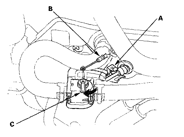 Heater Valve Cable Adjustment1. From under the hood, open the cable clamp (A), then disconnect the heater valve cable (B) from the heater valve arm (C).