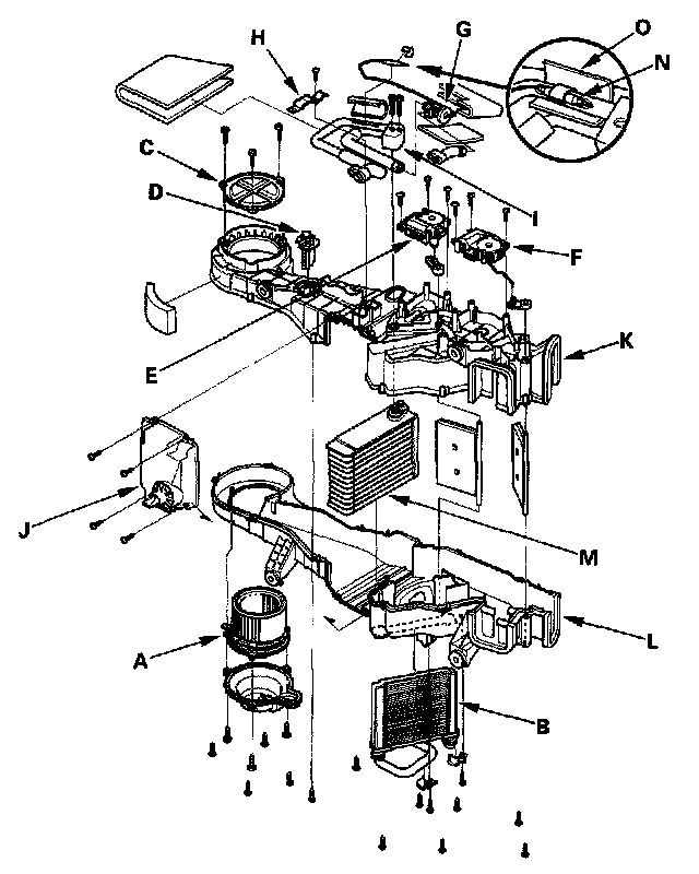3. Remove the self-tapping screws and the lower housing (J). Remove the self-tapping screws, and carefully separate the left upper housing (K) from the right upper housing (L). Remove the rear evaporator core (M).