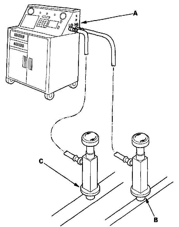 1. Connect a R-134a refrigerant recovery/recycling/charging station (A) to the high-pressure service port (B) and the low-pressure service port (C), as shown, following the equipment manufacturer's instructions.