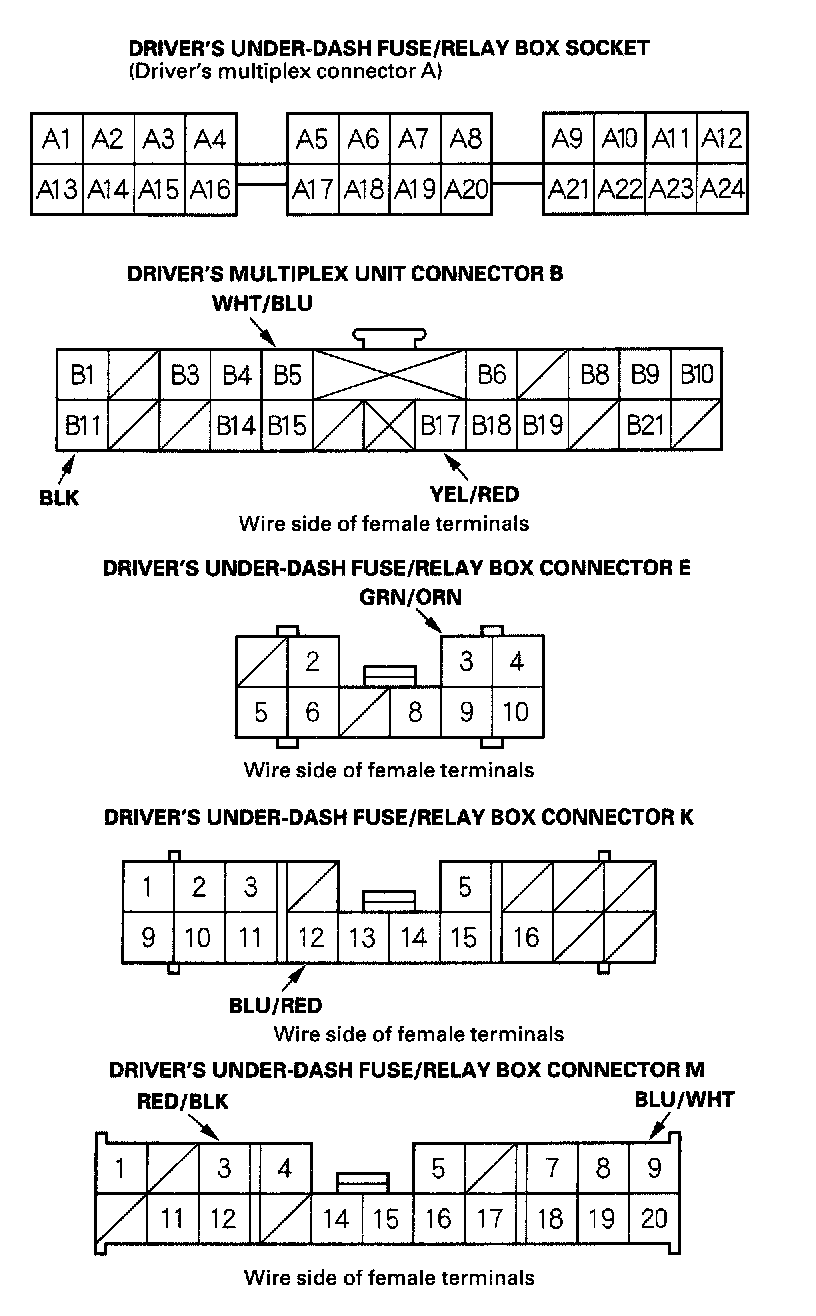 5. Reconnect the driver's multiplex control unit to the driver's under-dash fuse/relay box, and perform the following input tests at the appropriate connectors on the back of the driver's under-dash fuse/relay box. For driver's under-dash fuse/relay box connector socket location.
