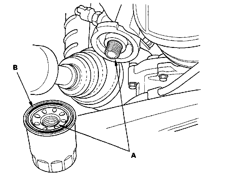 2. Inspect the threads (A) and rubber seal (B) on the new filter. Clean the seat on the engine block, then apply a light coat of oil to the filter rubber seal. Use only filters with a built-in bypass system.