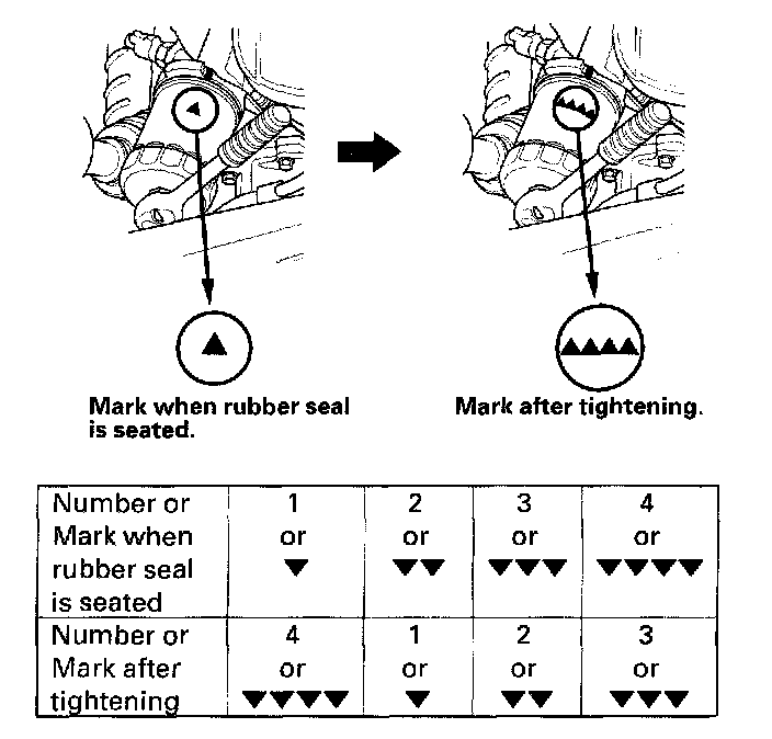 ^ Tighten the filter by turning it clockwise three numbers or marks from the one you noted. For example, if mark v is at the bottom when the seal is lightly seated, tighten the filter until the mark vvvv comes around to the bottom.