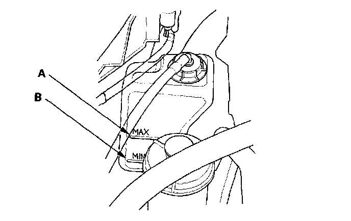 Check1. Look at the coolant level in the coolant reservoir. Make sure it is between the MAX mark (A) and MIN mark (B).