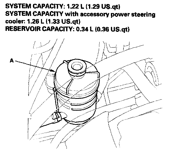 Fluid ReplacementCheck the reservoir (A) at regular intervals, and add the recommended fluid as necessary. Always use Honda Power Steering Fluid. Using any other type of power steering fluid or automatic transmission fluid can cause increased wear and poor steering in cold weather.