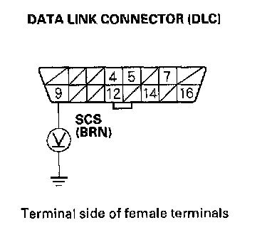 23. Turn the ignition switch OFF, then turn it back ON (II) and measure voltage between DLC connector terminal No.9 and body ground.