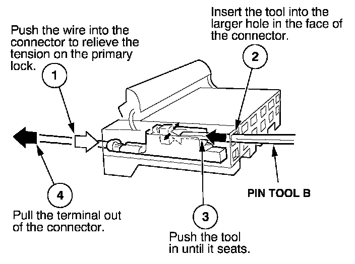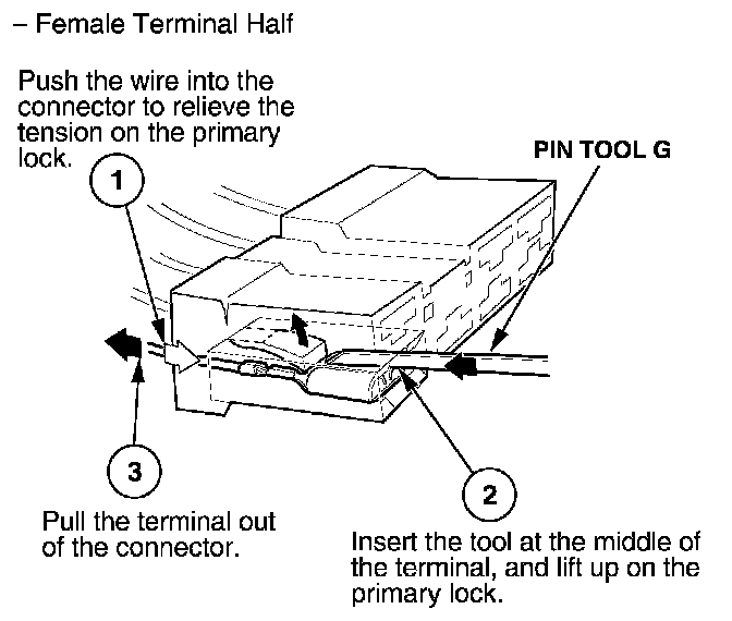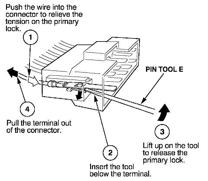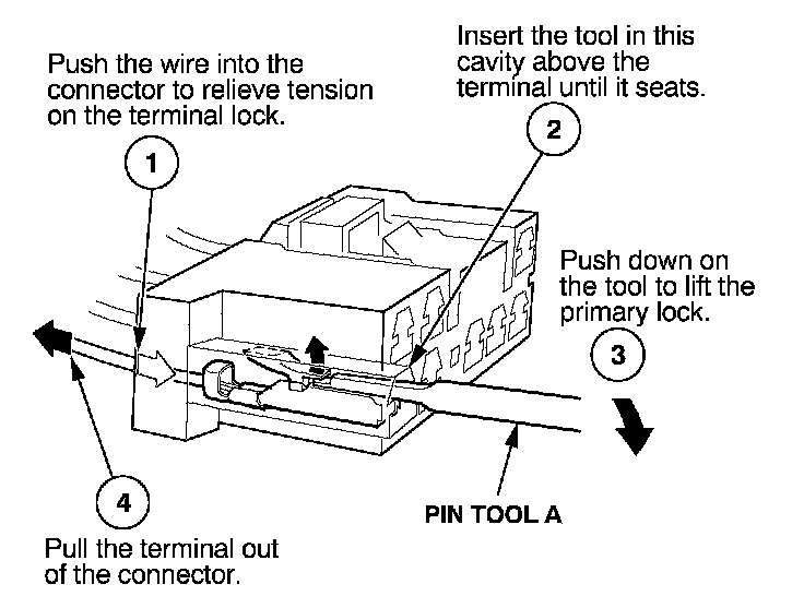 Before you begin, inspect the wire you are about to repair for damage and length. Make sure the wire will be long enough to make a terminal repair without stretching it when you reinstall the terminal in the connector. If the wire is too short, or if access to the connector is too restricted to make a terminal repair, you may need to install a pigtail terminal (a short length of wire with a factory-crimped terminal on it). Refer to HOW TO INSTALL PIGTAIL TERMINALS.