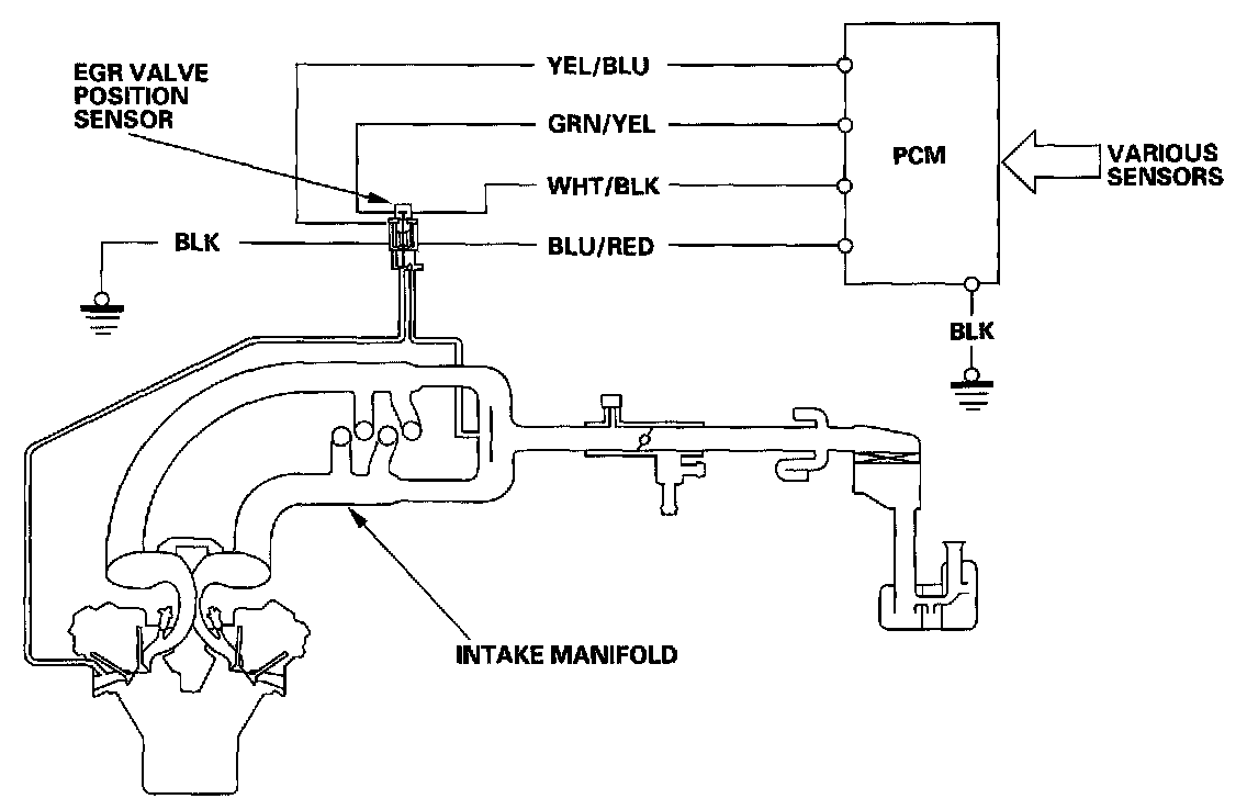 The EGR valve position sensor detects the amount of EGR valve lift and sends it to the PCM. The PCM then compares it with the ideal lift in its memory (based on signals sent from other sensors). If there is any difference between the two, the PCM cuts current to the EGR valve.