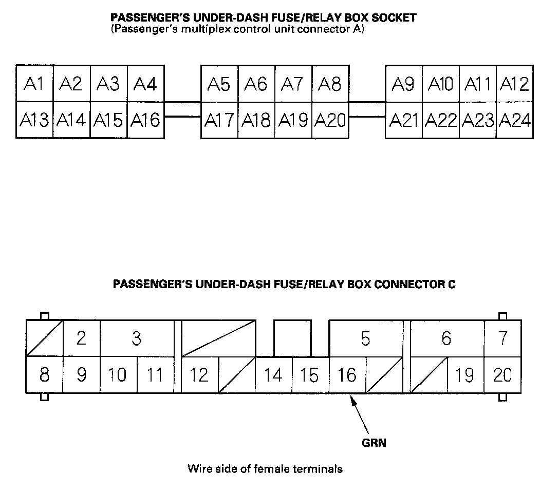 4. With the passenger's multiplex control unit still disconnected, make these input tests at the passenger's under-dash fuse/relay box socket.