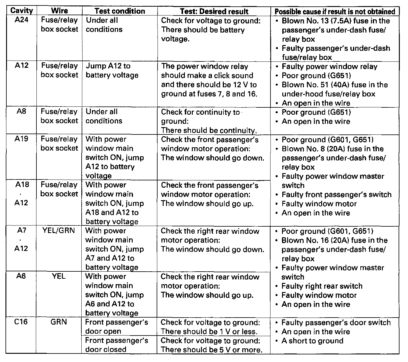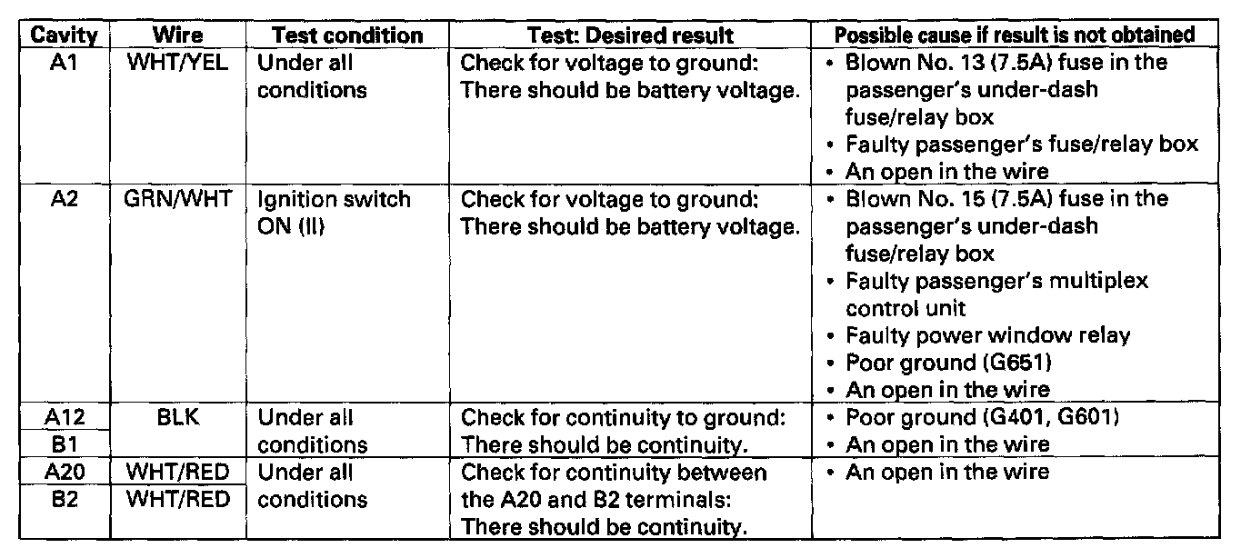 Control Unit Input TestNOTE: If the power window cannot be operated by its own window switch, the problem is not a multiplex control unit. Troubleshoot power or ground to the window switch or motor.