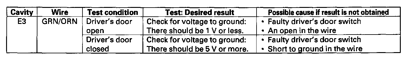 13. With the door multiplex control unit still disconnected, make these input tests at the connectors.