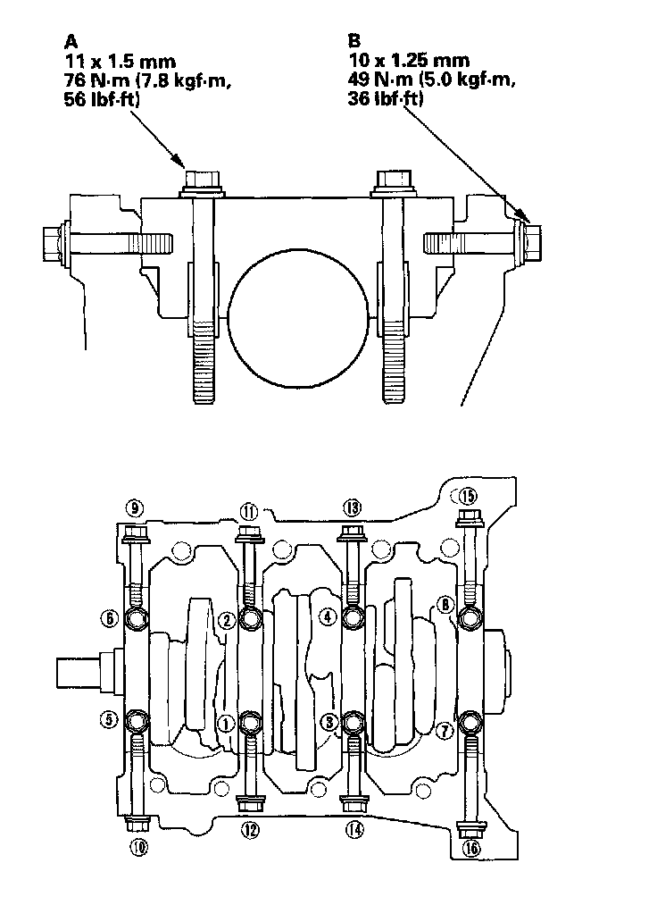 Tighten the bearing cap bolts and the bearing cap side bolts two turns at a time.
