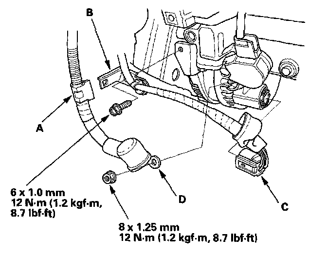 6. Disconnect the alternator connector (C) and BLK wire (D) from the alternator.