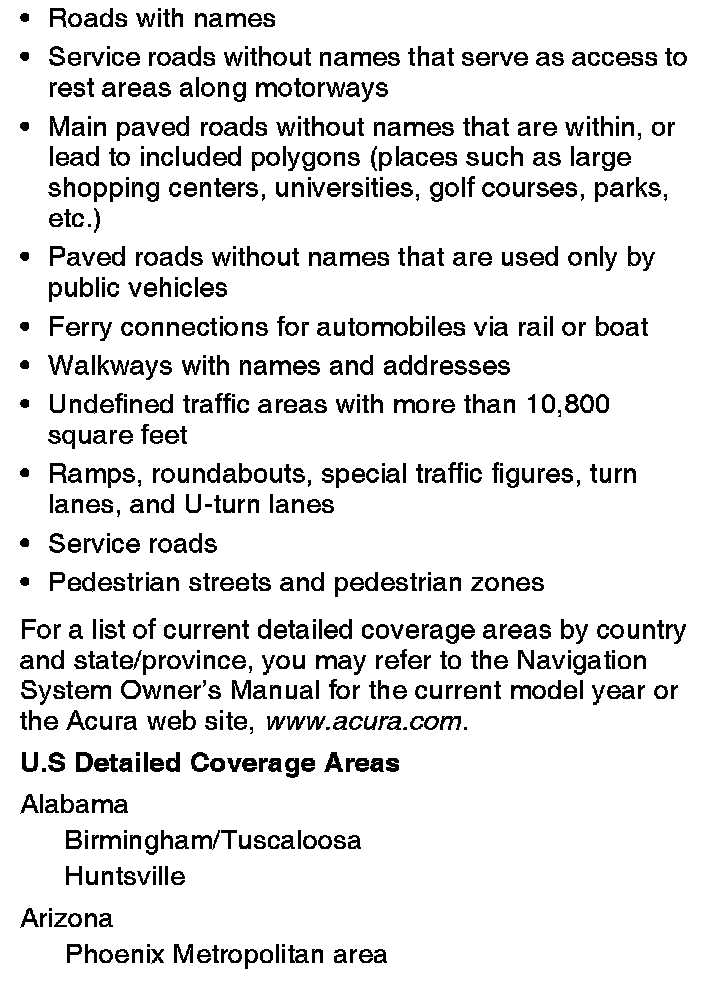 Cities and towns in the non-detailed map coverage area are not fully mapped. In the city listings that come up on the screen, these are denoted by a "*" next to the name. Only major federal, state, and county roads leading to and through these cities and towns are mapped. These "verified" roads are shown in black. All other streets are "unverified," and are shown in light brown. You can enter a destination in these areas, but your guidance will stop at the last verified road nearest to your destination. You can then use the dotted line to manually navigate to your destination. See "Traveling to your destination" in the Navigation System Owner's Manual.