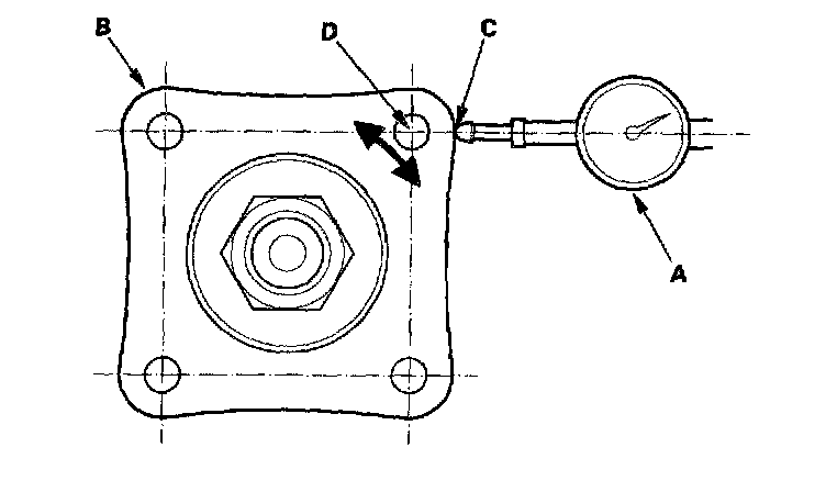 5. Set a dial indicator (A) on the transfer companion flange (B); position dial indicator tip (C) on the direct extension of the bolt hole center (D).