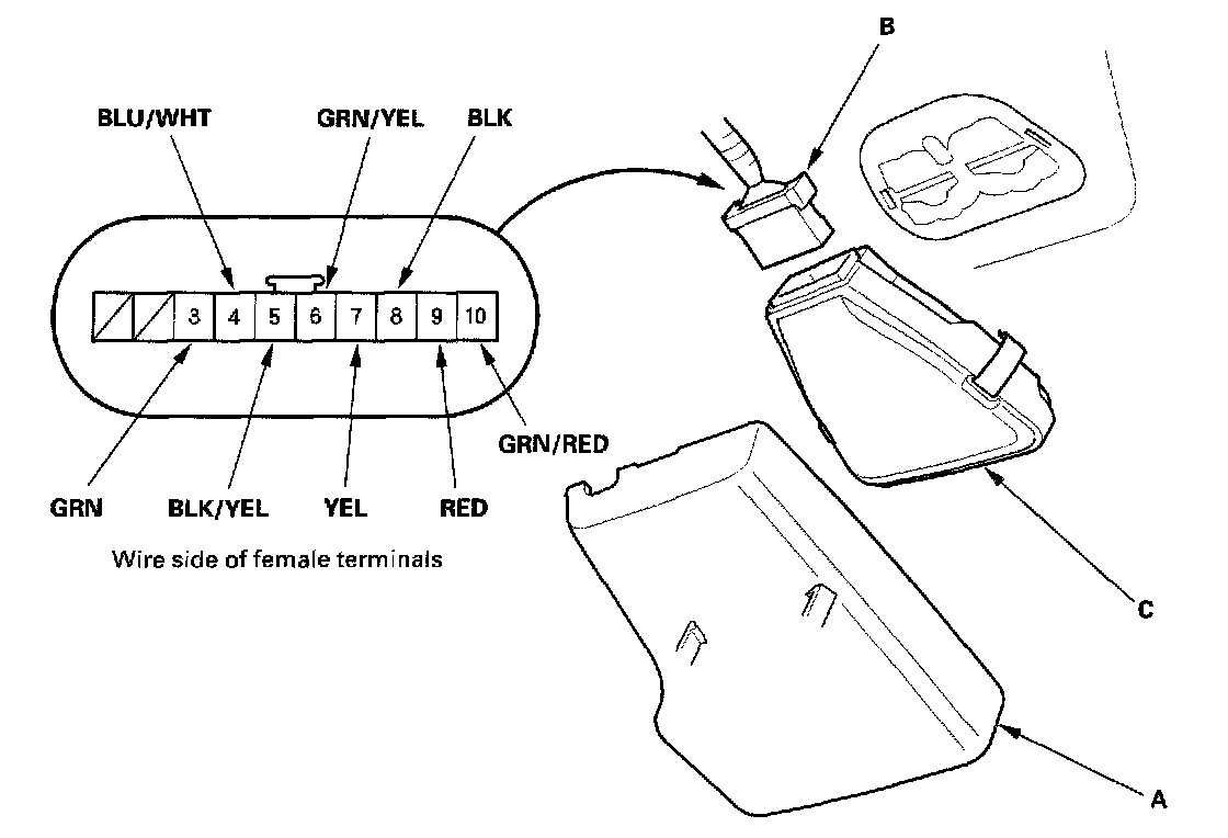 2. Disconnect the 10P connector (B) from the rain sensor/automatic wiper control unit (C).