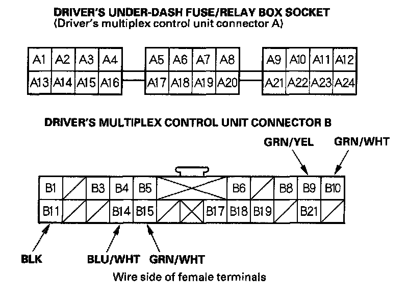 4. With the driver's multiplex control unit still disconnected, make these input tests at the connector and driver's under-dash fuse/relay box sockets.