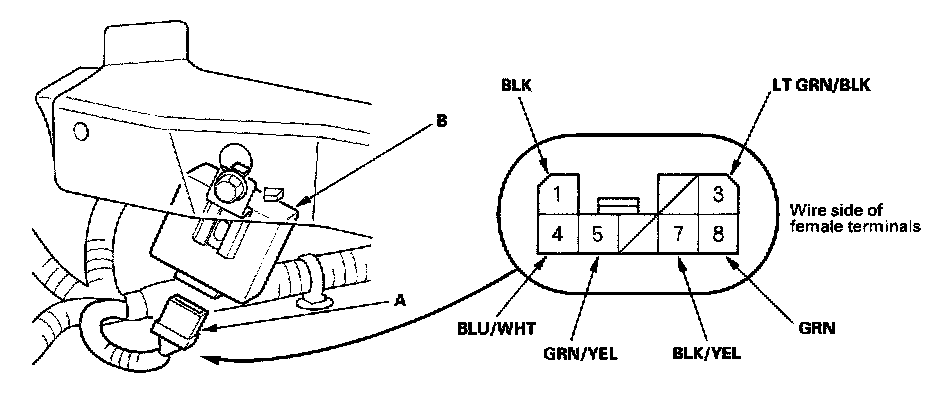 2. Disconnect the 8P connector (A) from the rear window wiper intermittent control unit (B).