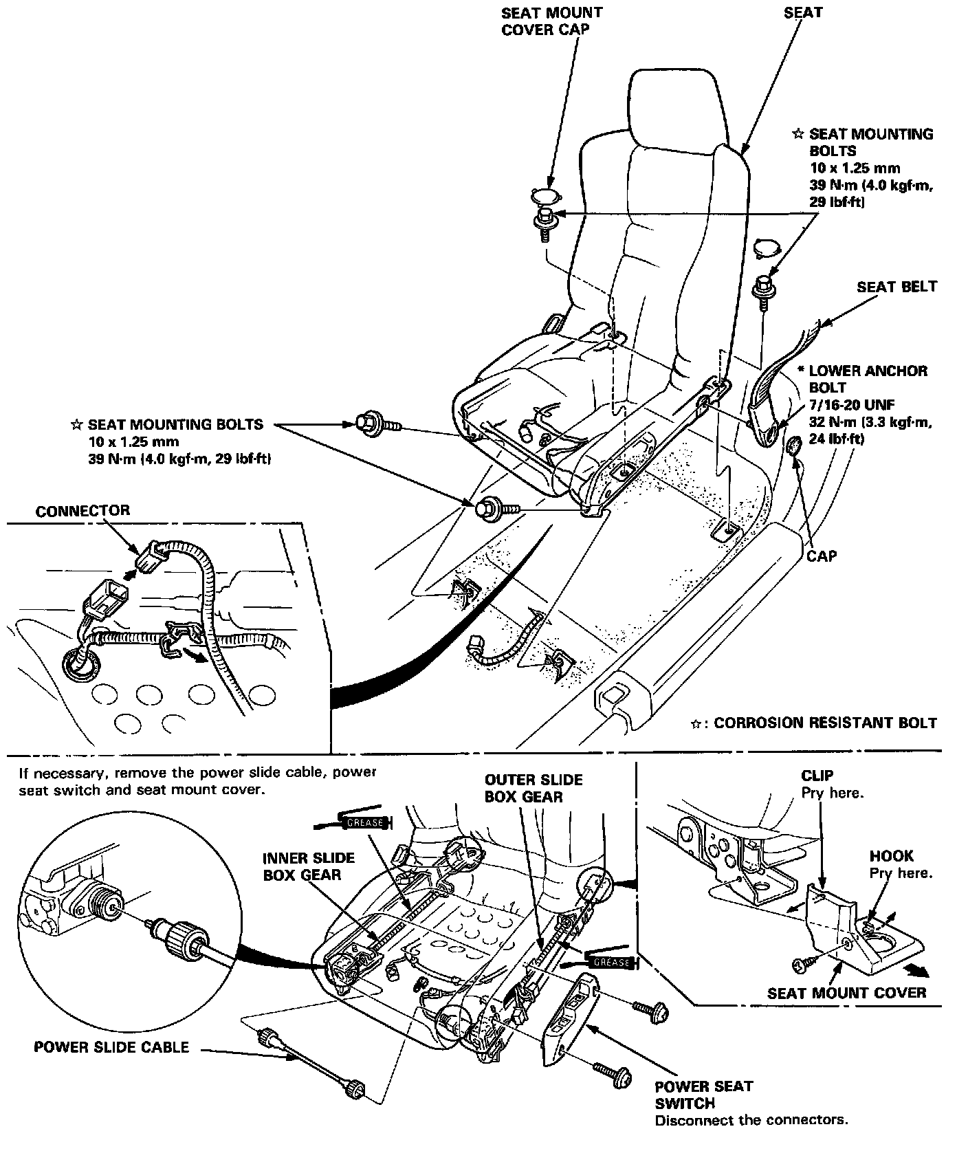 3. Pry out the cap, and remove the seat belt lower anchor bolt. Remove the seat.