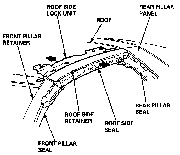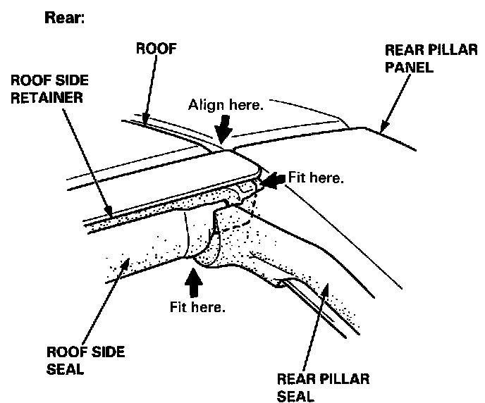 NOTE: Align the roof side retainer with the front pillar retainer and rear pillar panel evenly on each side, and make the seals fit flush.