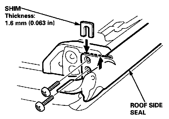 13. If you need to adjust the rear end of the roof side seal to fit against the rear pillar seal, remove the roof, then adjust the rear end of the roof side seal with a shim.