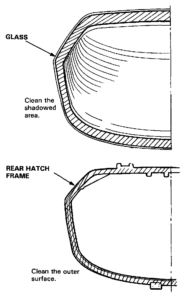 1. Use a putty knife to scrape off all traces of old adhesive and outer/inner rubber dams, then clean the rear hatch frame and glass (new) surface with alcohol where new adhesive is to be applied.