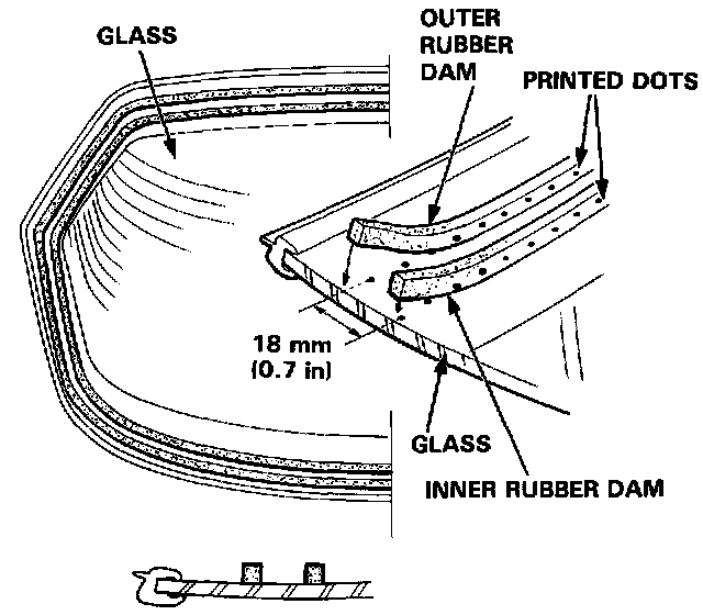 3. Glue the outer and inner rubber dams to the inside face of the glass, as shown, to contain the adhesive during installation.