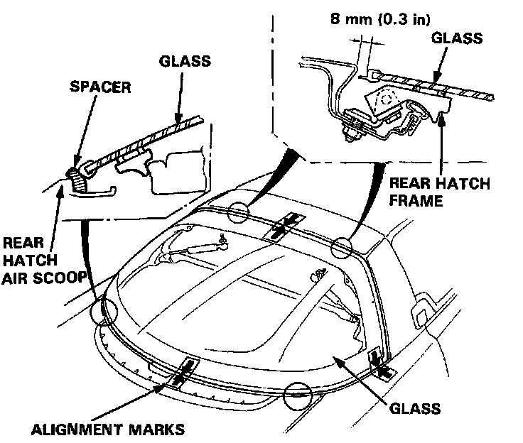 NOTE: Put several spacers between glass and rear hatch air scoop to prevent the glass from sliding down.