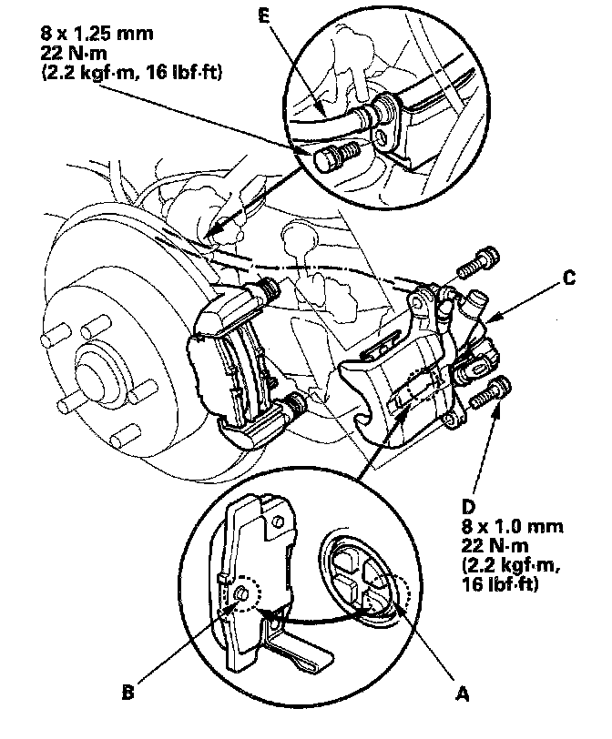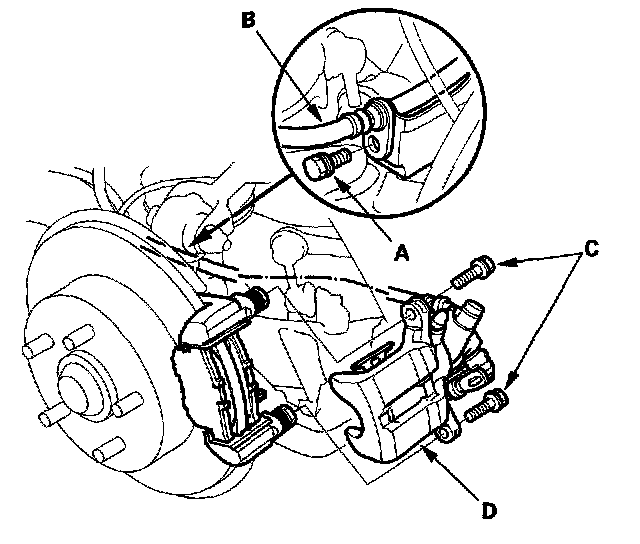 2. Remove the caliper bolts (C), and remove the caliper (D) from the caliper bracket.