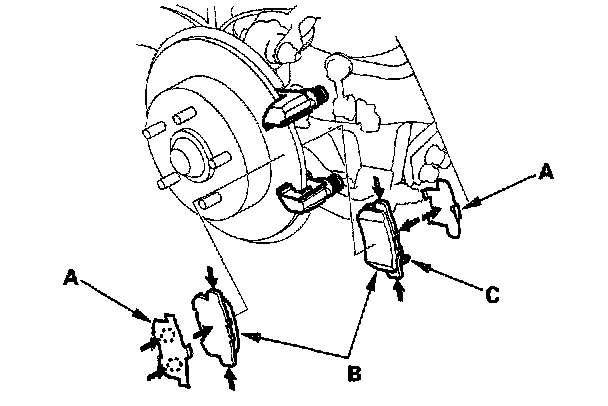 10. Install the brake pads and pad shims correctly. Install the pads with the wear indicators (C) on the inside.