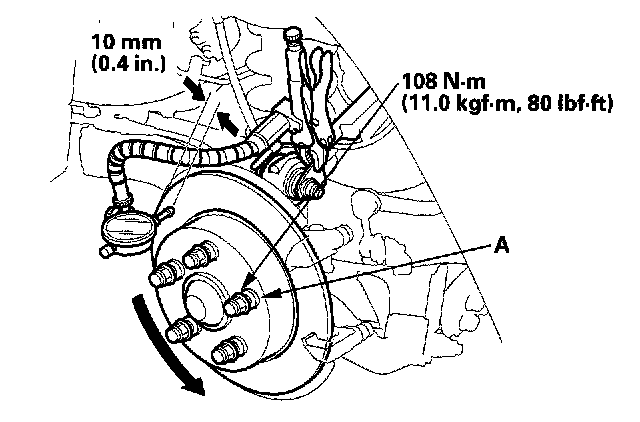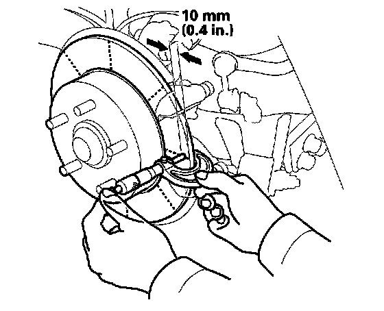 5. Set up the dial gauge against the brake disc as shown, and measure the runout at 10 mm (0.4 inch) from the outer edge of the disc.