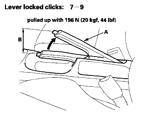 Check1. Pull the parking brake lever (A) with 196 N (20 kgf, 44 lbs.) of force to fully apply the parking brake. The parking brake lever should be locked within the specified number of clicks (B). Lever locked clicks: 7 - 9