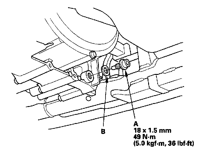 28. Disconnect the ATF cooler hose (A) from the ATF cooler line (B), then plug the end of the hose.