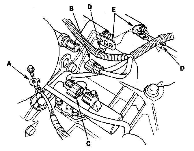 10. Disconnect the 2nd clutch pressure switch connector (B) and A/T clutch pressure control solenoid valve A connector (C), and remove the harness clamps (D) from the clamp brackets (E).