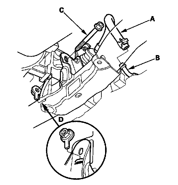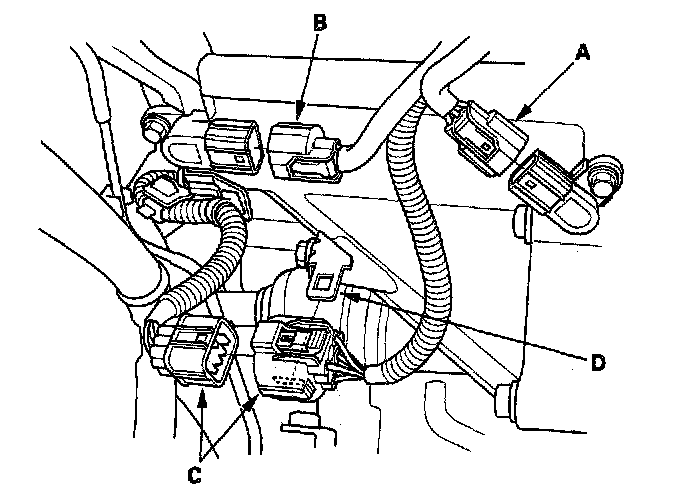 12. Remove the transmission range switch connector (C) from the bracket (D), then disconnect it.