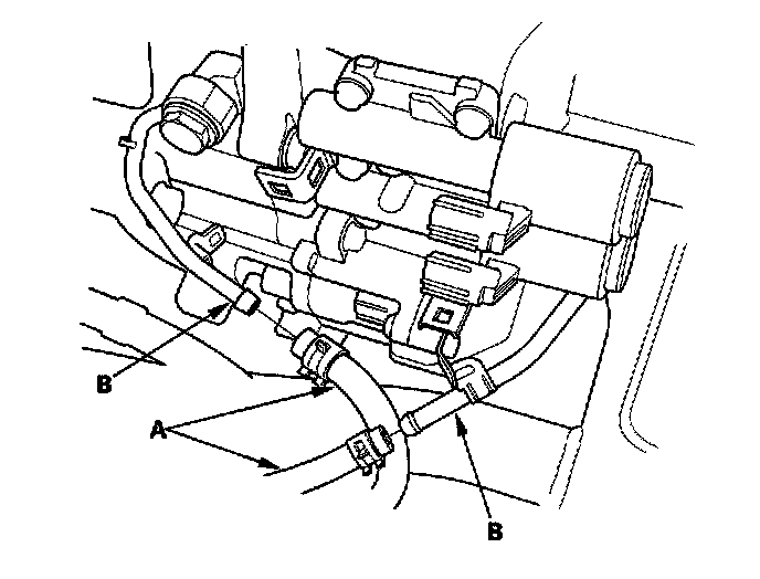 15. Remove the ATF cooler hoses (A) from the ATF cooler lines (B). Turn the ends of the ATF cooler hoses up to prevent ATF from flowing out, then plug the ATF cooler hoses and lines.