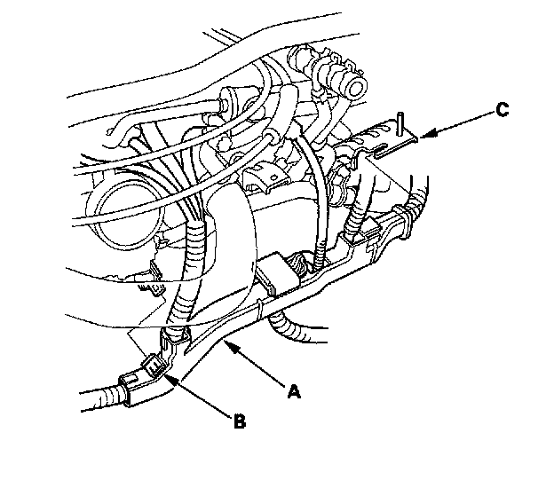 17. Remove the engine wire harness cover (A) by lifting up on the lock tab (B), then slide the harness forward off the air cleaner housing mounting bracket (C).