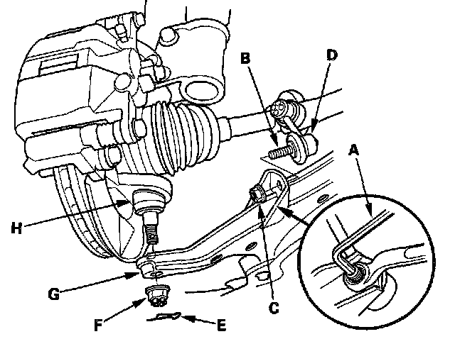 22. Remove the spring clips (E) and castle nuts (F), and separate the lower arms (G) from the knuckles (H).
