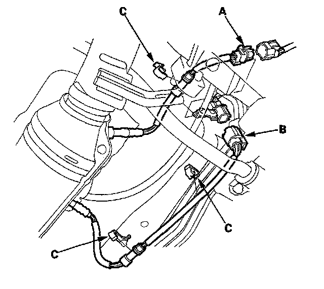 23. Disconnect the A/F sensor connector (A) and secondary HO2S connector (B), then remove the harness from the clamps (C).