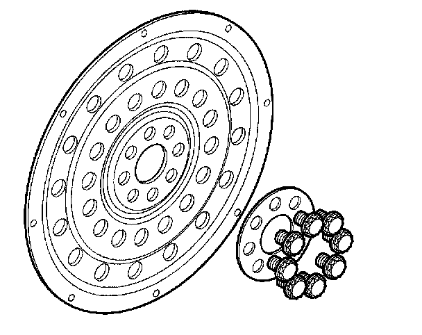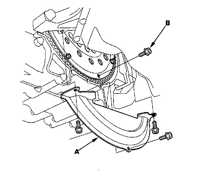 25. Remove the torque converter cover (A), and remove the eight drive plate bolts (B) while rotating the crankshaft pulley.